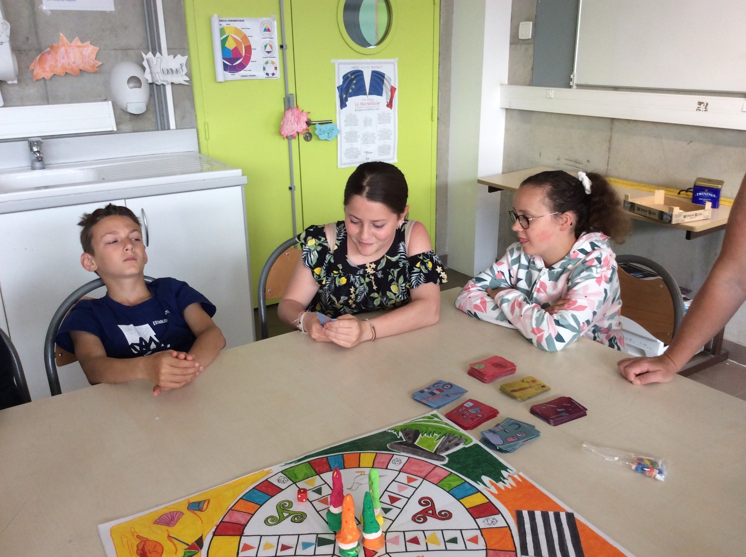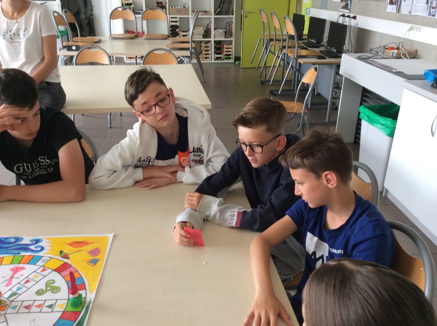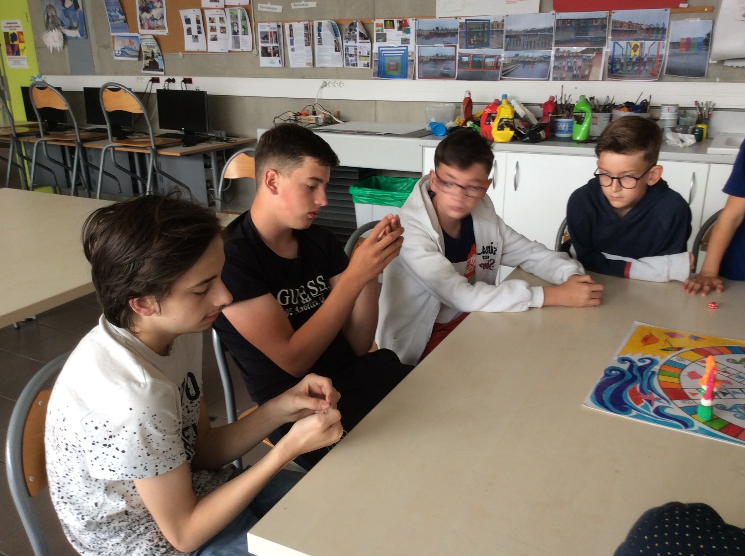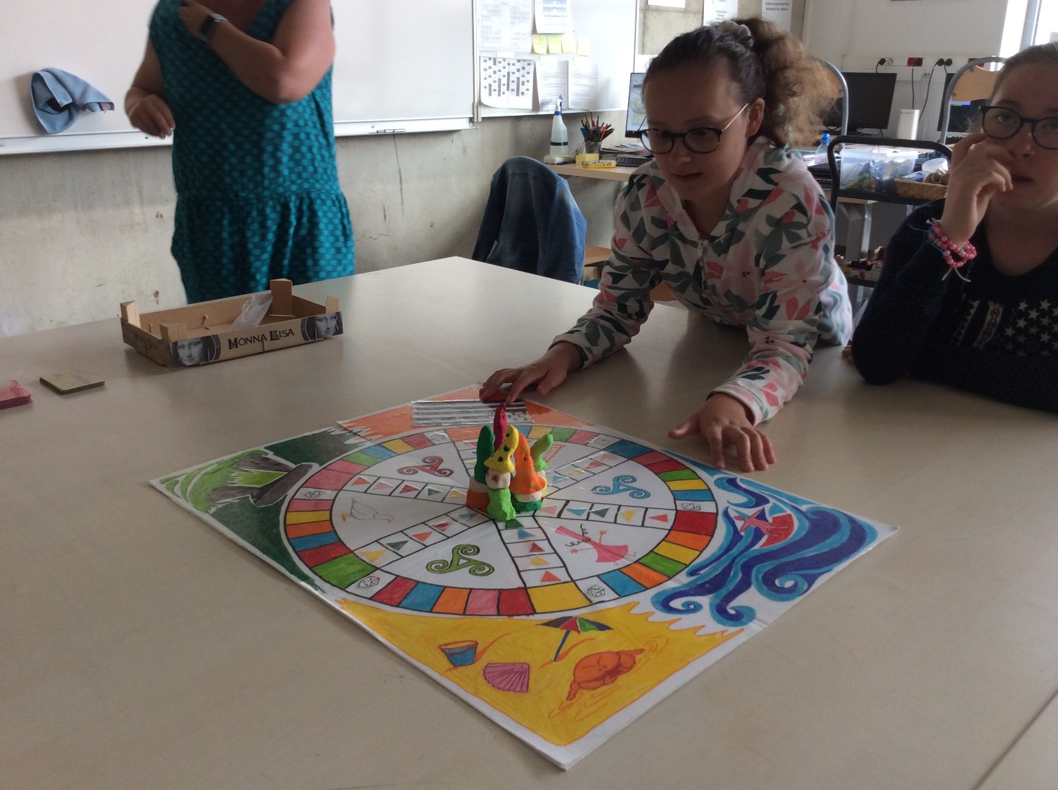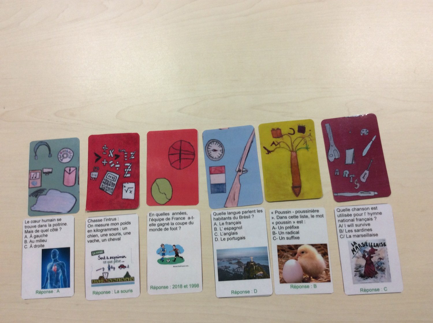Durant une partie de l'année, les élèves des deux dispositifs ULIS ont mis tout en œuvre pour réaliser un jeu de société. Ils ont travaillé sur la réalisation de questions par thème (mathématique, sciences, français, arts, sports, histoire et géographie), le dessin des dos de carte, la fabrication de pions et le plateau.