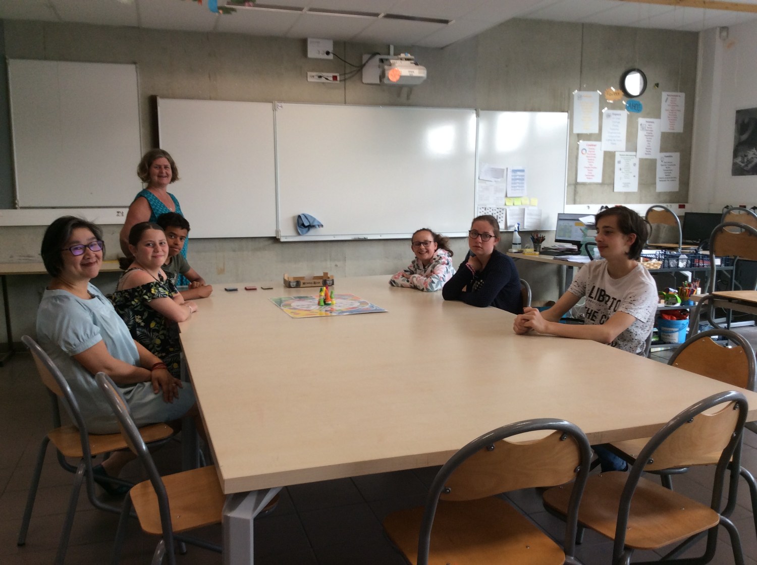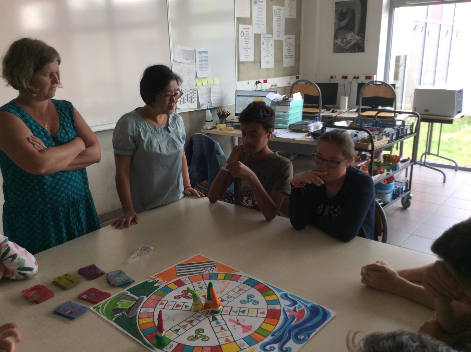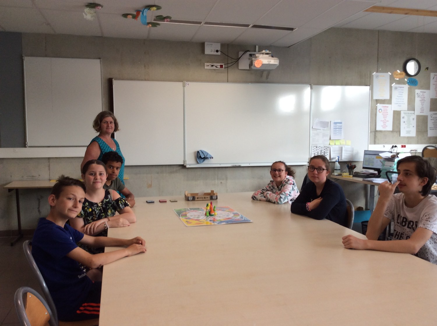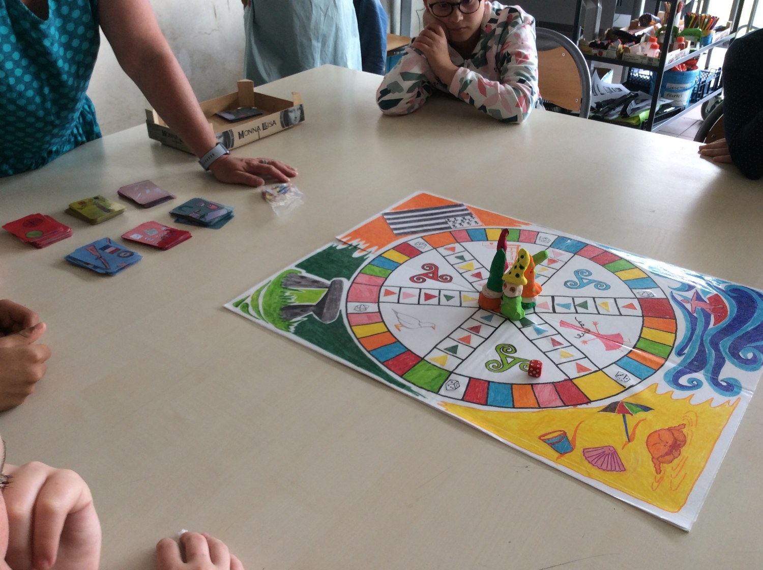 Durant une partie de l'année, les élèves des deux dispositifs ULIS ont mis tout en œuvre pour réaliser un jeu de société. Ils ont travaillé sur la réalisation de questions par thème (mathématique, sciences, français, arts, sports, histoire et géographie), le dessin des dos de carte, la fabrication de pions et le plateau.