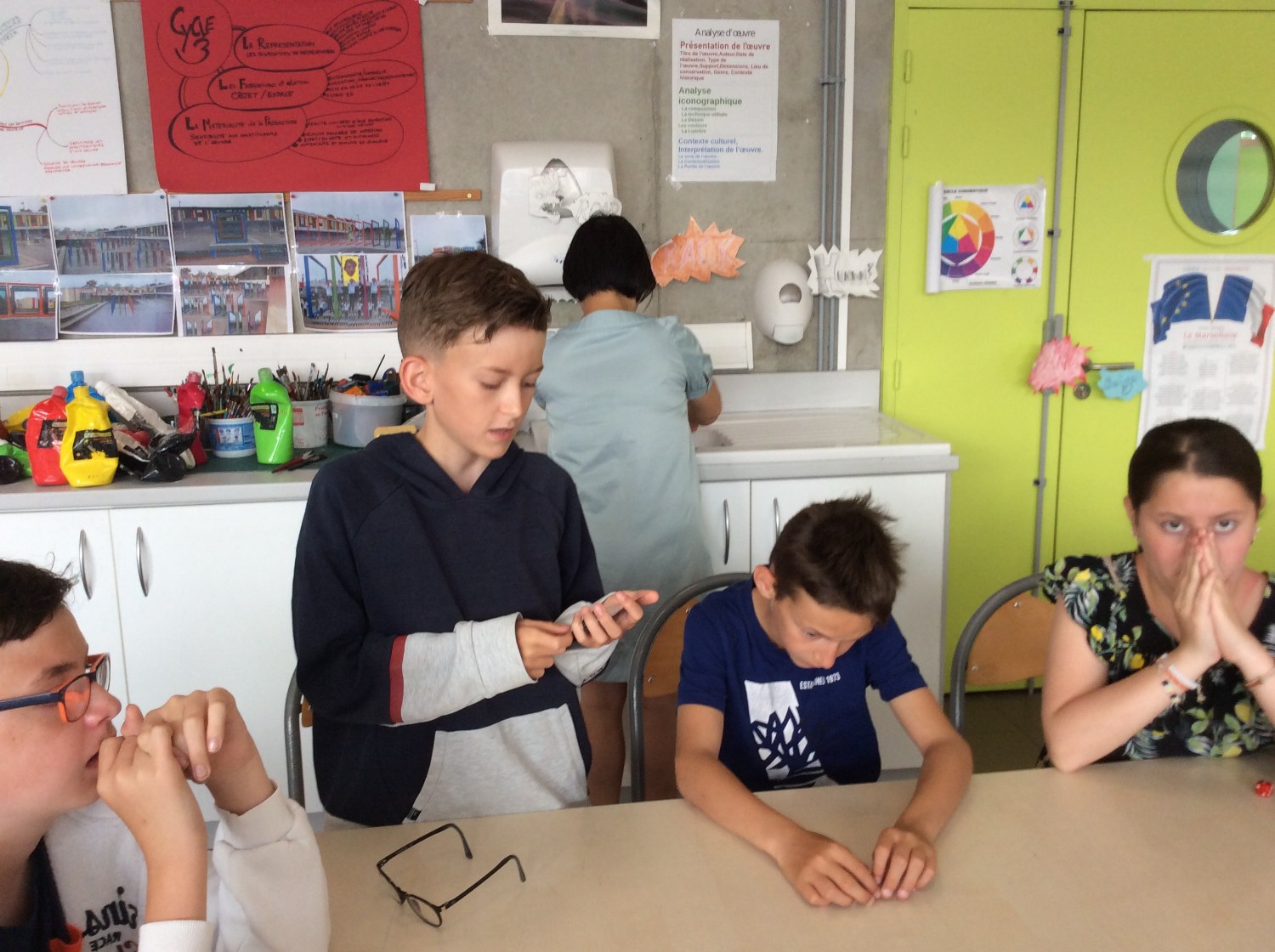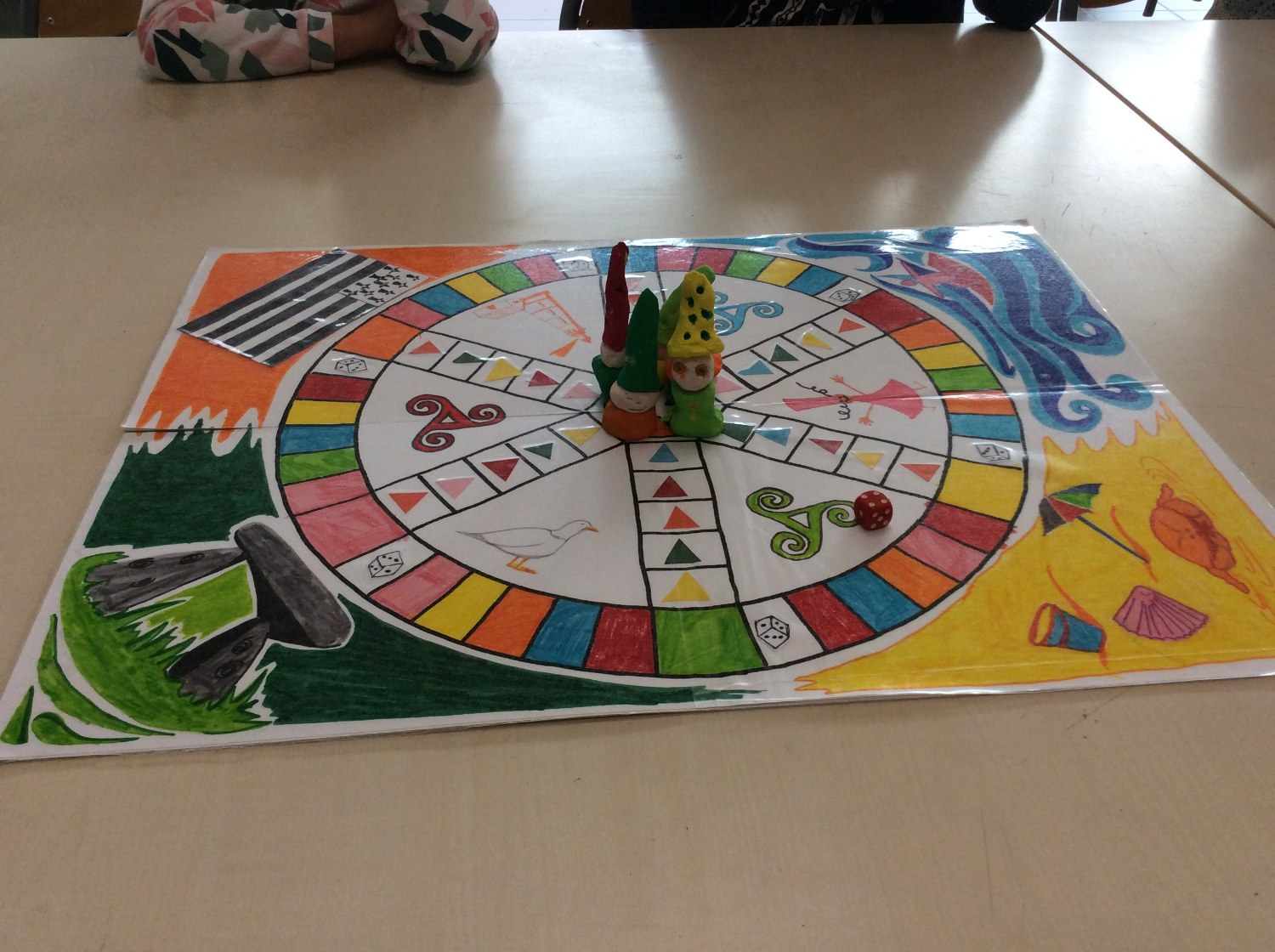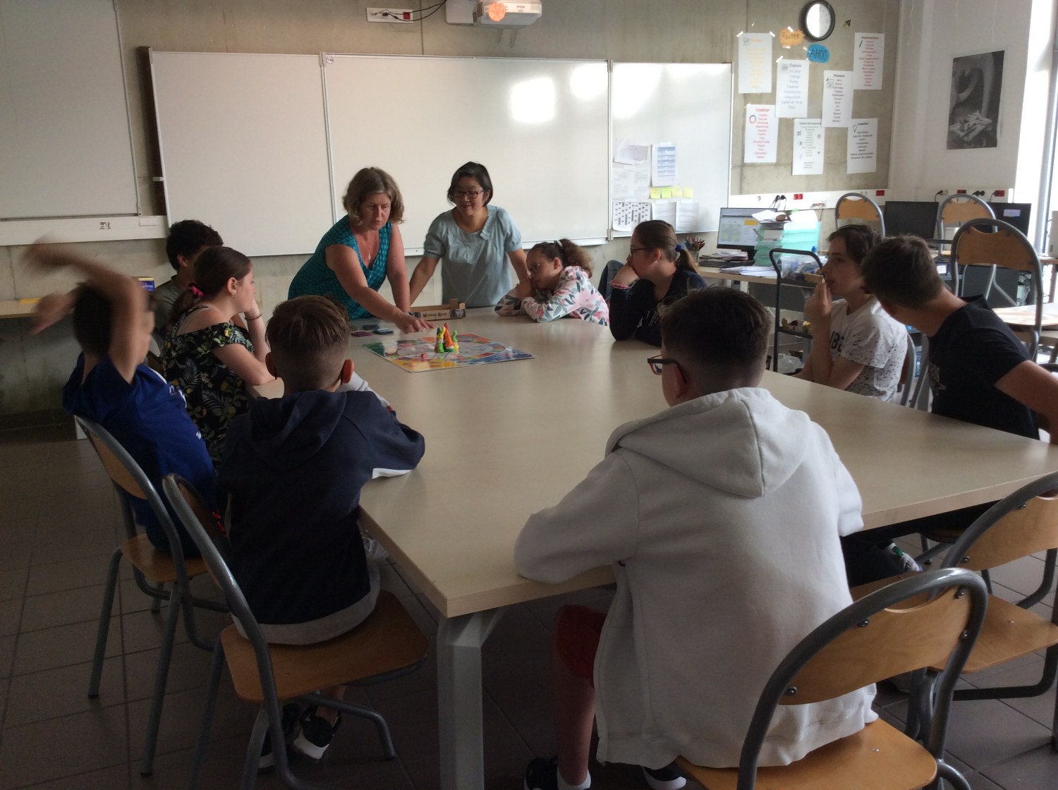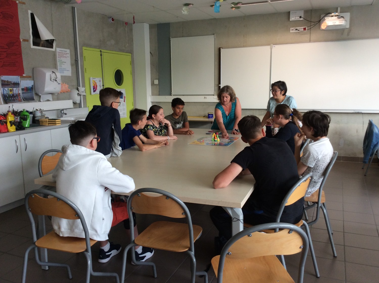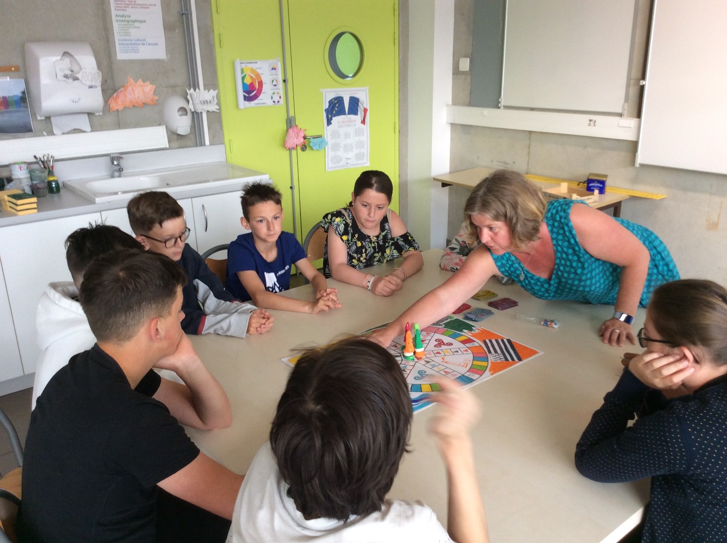 Durant une partie de l'année, les élèves des deux dispositifs ULIS ont mis tout en œuvre pour réaliser un jeu de société. Ils ont travaillé sur la réalisation de questions par thème (mathématique, sciences, français, arts, sports, histoire et géographie), le dessin des dos de carte, la fabrication de pions et le plateau.
