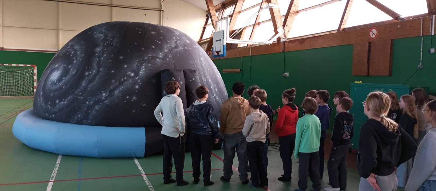 Chaque classe de 6e a bénéficié d’une séance d’une heure dans un planétarium gonflable, l’occasion de réviser la composition du système solaire, de parler des conditions de « vie » sur les planètes les plus proches de la Terre et d’aborder les changements de saisons.