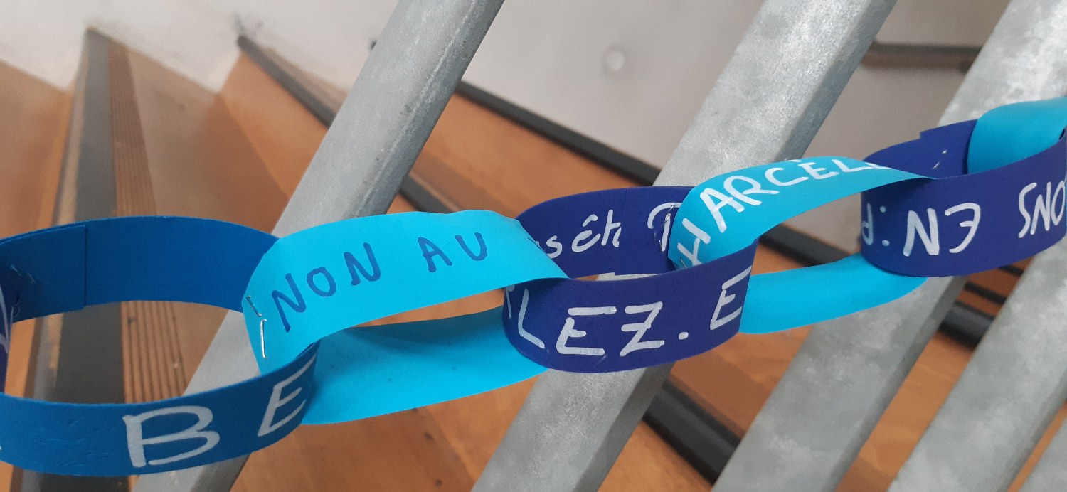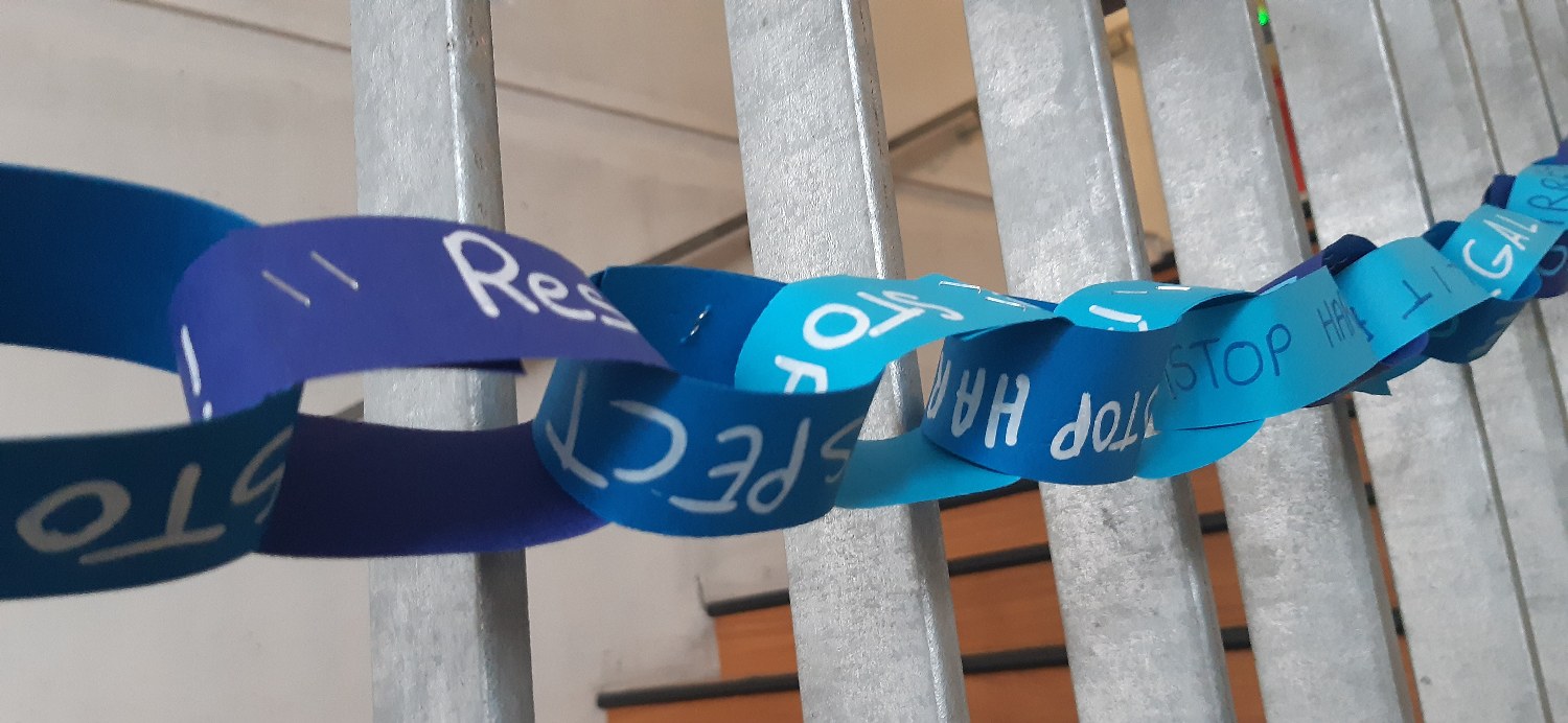 Sur la rampe de l’escalier du collège était exposée la guirlande de mots rédigés par les élèves lors du Blue Shirt Day de juin dernier*. Une guirlande qui rassemble des mots écrits par chacun tels que Respect, Solidarité, Tolérance, Bienveillance … une guirlande qui nous rassemble autour de ces valeurs fondamentales.